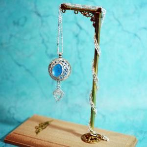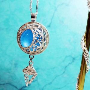 美しい海を表す淡い水色の硝子珠を、月の繊細な意匠で包み込んだ銀製のトップ。