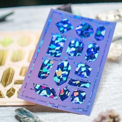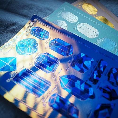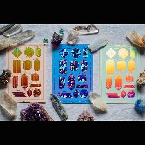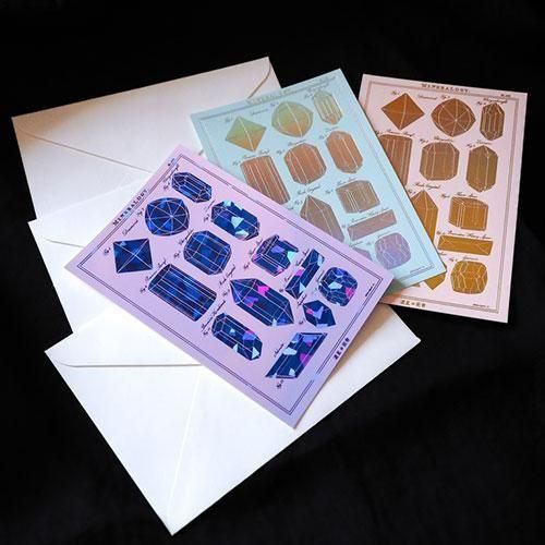 輝く結晶を印刷した葉書サイズの箔押しのカード3種×各1枚と、白い封筒3枚のセットです。