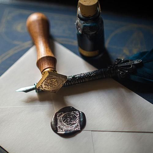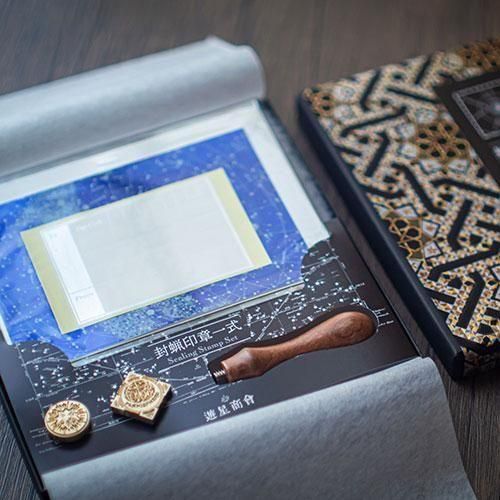 遊星商會さんオリジナルのシーリングヘッド2個とシーリングハンドル、ポストカードサイズの星図カードや封筒、宛名シールが入った豪華セットです☆