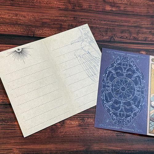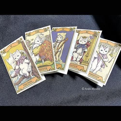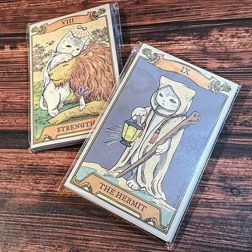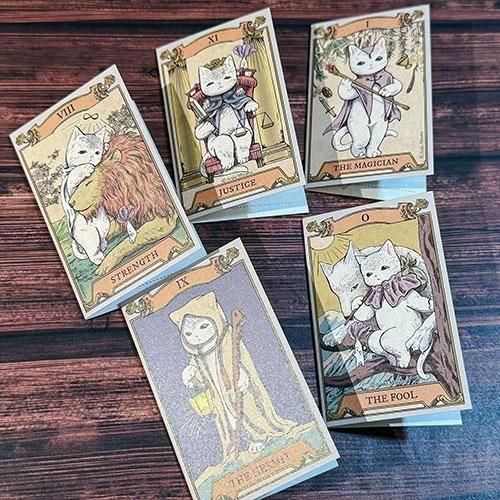それぞれ使い魔猫がテーマになった、隠者・愚者・魔術師・力・正義の5種類のアルカナがございます。2つ折りのメモカードになっているので、飾ったり贈り物に添えても。
